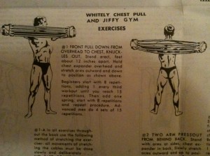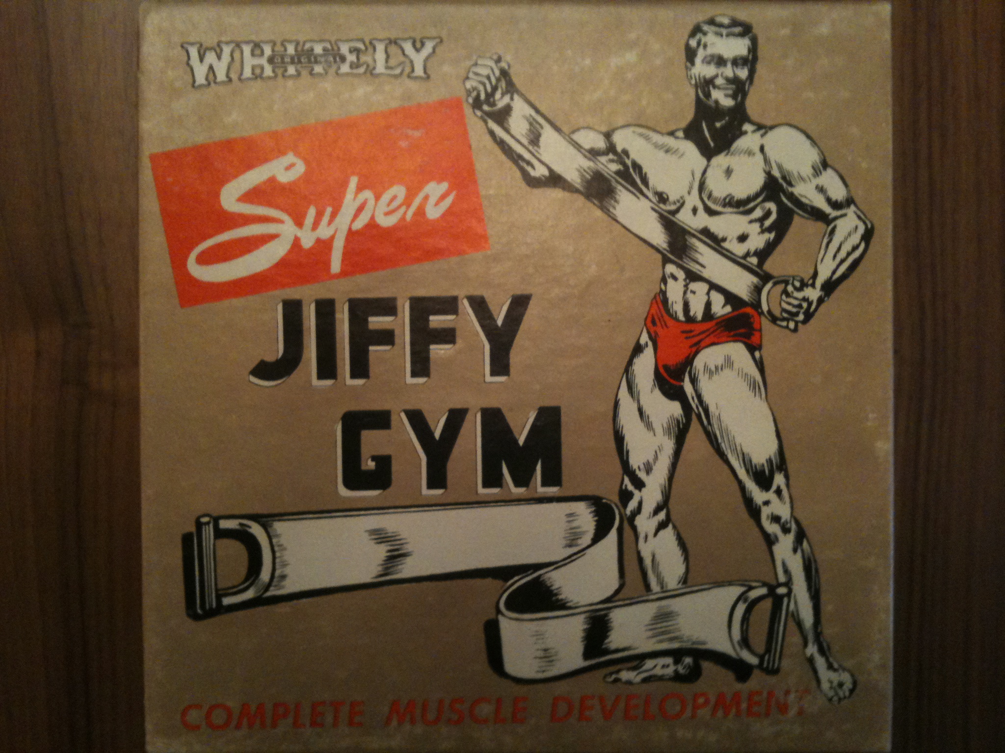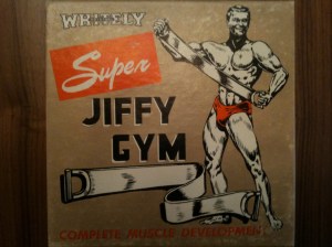 The Whitely Super Jiffy Gym looked promising. Best guess was with the invention of plastics, came the Super Jiffy Gym – a simplified version of the springed “chest pull” popularized by cartoons…you know the one that Tom and Jerry get tangled up in. Or was it Daffy Duck…